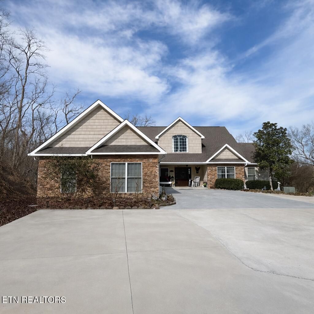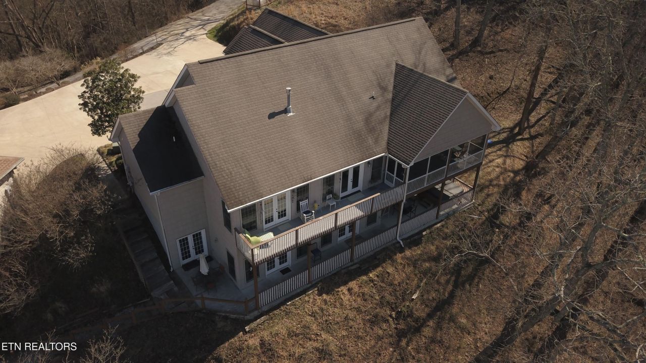 Tucked within a wooded Smoky Mountain setting, this lake house retreat blends mountain charm with inviting gathering spaces and seasonal lake and mountain views.Vaulted ceilings and expansive picture windows fill the open-concept main level with natural light, highlighting the warm textures of hardwood flooring and the welcoming gas fireplace. The living area flows effortlessly into the dining space and kitchen, where granite countertops, a generous island, and black and stainless-steel appliances create a functional space for entertaining.A charming spiral staircase leads to a loft overlooking the main living area, offering an additional cozy retreat within the home.The main-level primary suite provides balcony access and a spacious ensuite bath designed for relaxation, complete with a soaking tub, walk-in tile shower, dual vanities, and a walk-in closet. with one bonus room.The fully finished lower level expands the experience of the home with a large recreation room, home theater, and kitchenette--ideal for hosting gatherings, movie nights, or game-day entertainment. Two bedrooms with ensuite bathrooms and patio access provide comfortable accommodations for guests.Outside, the patio invites relaxation with a private hot tub and access to a trail leading toward the lakeside. The wooded surroundings and seasonal views enhance the peaceful atmosphere of this Smoky Mountain retreat.With three bedrooms, three and a half bathrooms, and two bonus rooms, this thoughtfully designed property offers versatile living spaces suited for both personal enjoyment and hosting.