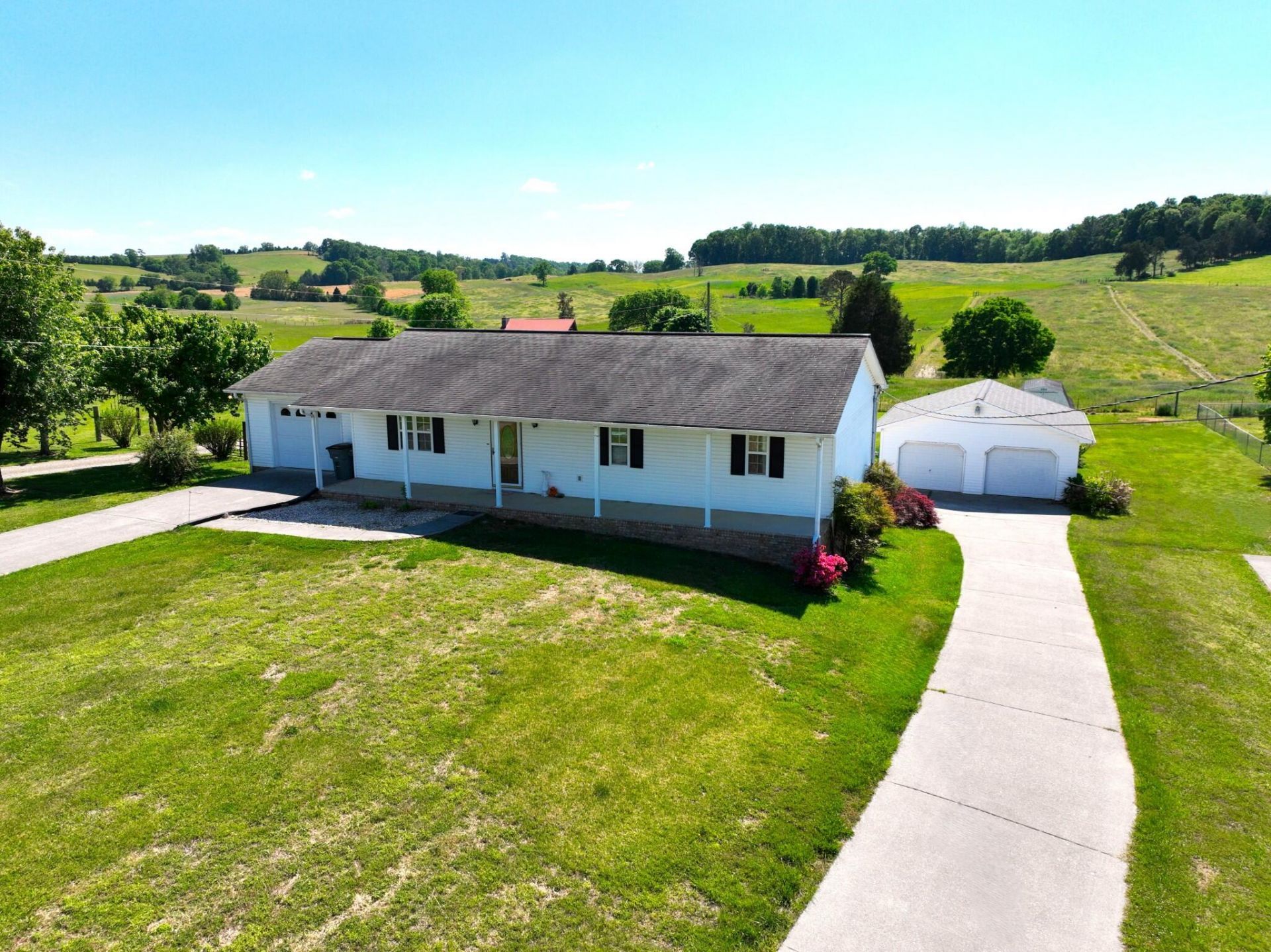 Charming ranch-style home situated on 0.62 acres, offering 3 bedrooms and 3 full bathrooms. Enjoy relaxing on the spacious covered front porch, perfect for morning coffee or evening unwinding. This well-maintained home features a warm, inviting interior with classic character and timeless appeal. Car enthusiasts or hobbyists will appreciate the 5 total garage spaces, including a 3-car attached garage and an additional 2-car detached garage. A wonderful opportunity for comfortable living with plenty of space, both inside and out.