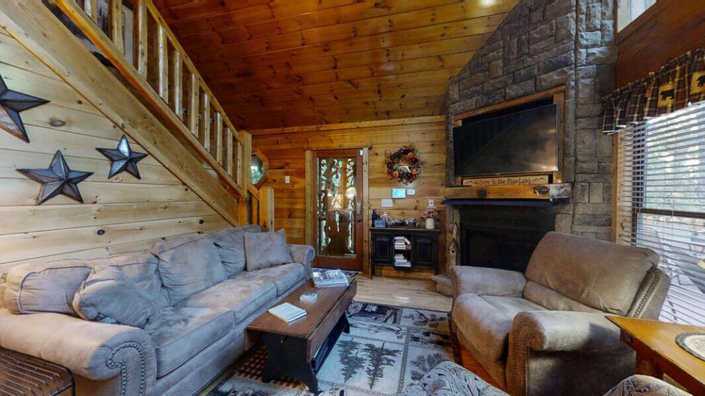 Serenity abounds in this beautiful mountain cabin sleeping 8 (one king, one queen, and sleeper sofa). This property has been very successful as a short term rental and is just a short distance from Wears Valley Road. You will be welcomed by hand-carved wooden gates as you enter the quaint, upscale cabin community of Laurel Valley Falls. Your first impression of this cabin will be that it has been very well-maintained and is in amazing condition. On the main level, you will find a spacious and beautifully decorated living room with vaulted ceilings, exposed beams, stacked stone gas fireplace, and lots of windows for enjoying the wonder of the Smokies from indoors. From the living room, you'll enter into the well-appointed and fully-stocked eat-in kitchen with stainless steel appliances and tons of cabinet space as well as a closet housing the stacked washer and dryer. Just off the kitchen you'll find the large master suite with a king size bed and enormous bathroom. This lovely master suite features a double-sided gas fireplace to enjoy while soaking in the jetted bathtub or simply relaxing in bed after a day of hiking in the National Park. If the jetted bathtub isn't your preference, there is also a huge, beautifully tiled shower that was designed for two. Upstairs in the loft area, you will find queen-size bed, an amazing sauna, multicade video game system and a cozy sitting nook with a couch and TV which is situated to allow for great views of the peaceful forest outside. If you're able to tear yourself away from the spa-like setting of this cabin and head outside, you will find that the exterior of this cabin is top-notch as well. From the custom hand-carved front door overlay to the oversized decks with great hot tub and room for a dining table and seating for plenty of guests, you'll find yourself immersed in quality while you enjoy taking in the beauty of the Great Smoky Mountains from the comfort of your private sanctuary.