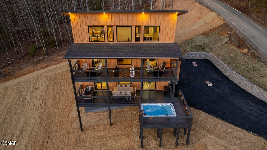 BRAND NEW & FULLY FURNISHED LUXURY 4 BEDROOM CABIN IN THE SMOKY MOUNTAINS WITH AMAZING VIEWS & A SWIM SPA! Prepare to be in awe of the mountain views, ease of access with no steep roads, and the absolute elegance & craftsmanship this property exudes! This stunning cabin has been professionally designed and offers unparalleled luxury complete with higher end furnishings with 2 king size beds and 2 queen beds. The double deck on the back is the perfect spot to drink your morning coffee or soak in the swim spa and get lost in the views of the Smoky Mountains! The main level features a spacious layout perfect for gathering, soaring tongue and groove ceilings, floor to ceiling electric fireplace in the heart of the space, a custom kitchen that comes fully stocked, primary suite with custom tile walk-in shower, laundry area, and half bath. Upstairs includes numerous windows to delight in the gorgeous views while playing in the game room with wet bar and living area with a second floor to ceiling fireplace, three additional bedrooms, and two full baths with custom tile work. The loft offers huge windows with breathtaking views, workout equipment and creative play, great for everyone! Located in a quiet area, yet close to Gatlinburg & Pigeon Forge, this cabin and its views are sure to be a guest favorite! Buyer and/or buyer's agent to verify details. Rental projection in documents tab.