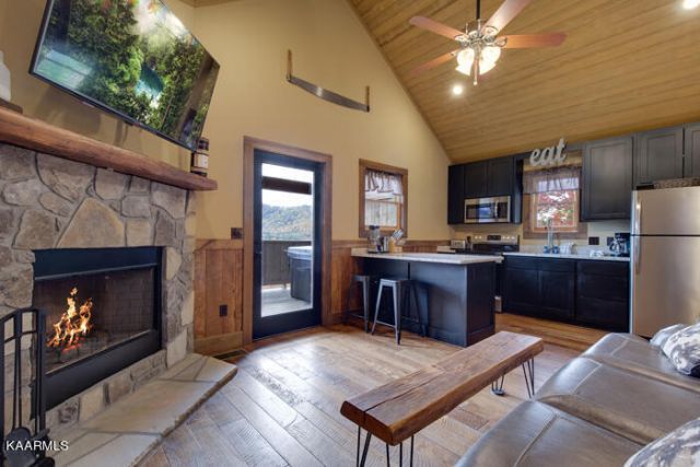 Looking for a great investment with spectacular views of the Great Smoky Mountains? Then you have found it with Lost Horizon. Turnkey ready with everything you will need for a second home or overnight rental. Great open floor plan in this luxury cabin with a leather queen sleeper, a king bed, superb views of the Smokies from the dining area and deck. A fully furnished kitchen with granite counters, dishwasher, stove, microwave and refrigerator. Washer/dryer in unit. The living room area features a big screen TV and high speed internet. Enjoy the stone fireplace on cool evenings. Or go outside to the picnic area, or cook on the outdoor fire pit or charcoal BBQ grill. The deck features some of the best views around, extra seating, a TV and large hot tub. Sleeps 4. Buyer to verify all information.