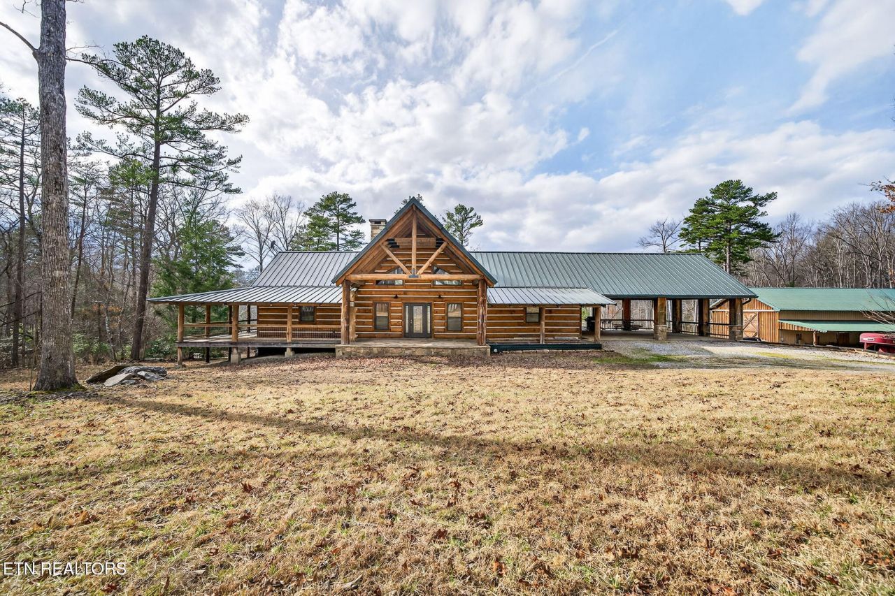 This impressive stone and stick-frame home, wrapped with heavy log siding, is set on 12.4 scenic acres overlooking a private 4+ acre stocked pond--perfectly designed to capture the beauty and lifestyle of Tennessee mountain living.This custom home showcases impressive large log beams, professional stone masonry throughout, tongue-and-groove wood ceilings, hardwood floors, Anderson windows, and a durable standing seam metal roof--creating the perfect blend of rustic craftsmanship and modern comfort.The main living area features cathedral ceilings and a floor-to-ceiling stone wood-burning fireplace and plumbed for natural gas logs as well, creating a warm and inviting gathering space. The spacious kitchen and dining area offers granite countertops, abundant cabinetry, two sinks, and a 36-inch Wolf gas range, ideal for cooking and entertaining. The formal dining area is surrounded by large windows overlooking the peaceful pond.The primary suite upstairs features beautiful trey tongue-and-groove ceilings and a private covered balcony overlooking the water--perfect for enjoying quiet mornings or breathtaking sunset views. The ensuite bath includes a large tiled shower and an oversized walk-in closet.The walkout basement provides excellent additional living space with two bedrooms, a full bath, living area with natural gas heater, and a full kitchen, making it ideal for guests, extended family, or potential rental use. The basement also features poured concrete walls, natural stone exterior, a mechanical room with natural gas tankless water heater, and access to a covered patio.Outdoor living is exceptional with over 1,500 square feet of covered porches upstairs, offering multiple spaces to relax, entertain, and enjoy the peaceful surroundings. The 4+ acre pond is stocked with bass, catfish, and bream and reaches depths of approximately 13 feet, making it perfect for fishing, kayaking, or swimming. A dock and gazebo overlook the water, and a zip line across the pond adds a fun and adventurous touch.The home also features an attached 896-square-foot covered carport with adding function and rustic character.Additional improvements include an impressive 30x60 detached garage/workshop designed with versatility in mind, featuring 15x15 foot garage doors perfect for RV storage, spray foam insulation, and a natural gas heater. The space also includes a bedroom loft with closet, full kitchen, and full bathroom, making it ideal for guests, hobbies, or extended stays. Lean-to storage on both sides provides additional covered space for equipment or trailers.The property also features a 3-stall horse lean-to barn, creating a wonderful setup for horse lovers or those wanting to enjoy the full experience of country living.With 12.4 acres, a private stocked pond, horse facilities, and room to explore, this property truly captures the essence of Tennessee mountain living--offering peaceful surroundings, space for animals, and endless opportunities for fishing, outdoor recreation, and enjoying the natural beauty of the countryside.The home is serviced by public water, natural gas, and fiber-optic internet, making working from home easy while enjoying a quiet mountain-style setting. Located in the desirable 8,000-acre Cumberland Cove community between Cookeville and Crossville, property owners enjoy access to four private parks with hiking trails, waterfalls, caves, and scenic overlooks.