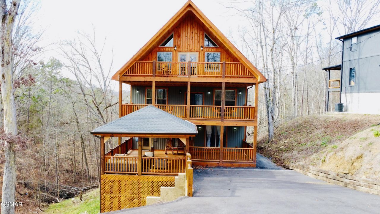 This beautifully designed cabin in Sevierville is ideally located just minutes from Douglas Lake, Pigeon Forge attractions, Gatlinburg, and Great Smoky Mountains National Park, making it a perfect personal retreat or income-producing property. As you arrive, you're welcomed by a covered front porch with seating, an inviting space ideal for relaxing or entertaining guests. Step inside to an open main living area featuring a recliner sofa, large TV, and cozy fireplace, creating a warm and comfortable atmosphere. The kitchen is well appointed with granite countertops and Samsung glass appliances, and the main level also includes a half bath, laundry area, and access to a covered back porch with BBQ grill and hot tub, perfect for enjoying the mountain setting year-round.The second floor offers three bedrooms, including two that share access to a covered balcony and hot tub, along with a full hallway bathroom. The primary suite is a true retreat, complete with a private sauna, a beautifully finished bathroom featuring a walk-in shower and soaking tub, and its own covered balcony. The third floor is dedicated to fun and entertainment, featuring a full bathroom, two additional beds, multiple entertainment options, along with covered balconies on both sides.The cabin is being sold fully furnished, is turn-key, and ready for overnight rental, offering an exceptional opportunity in one of the Smokies' most sought-after locations.