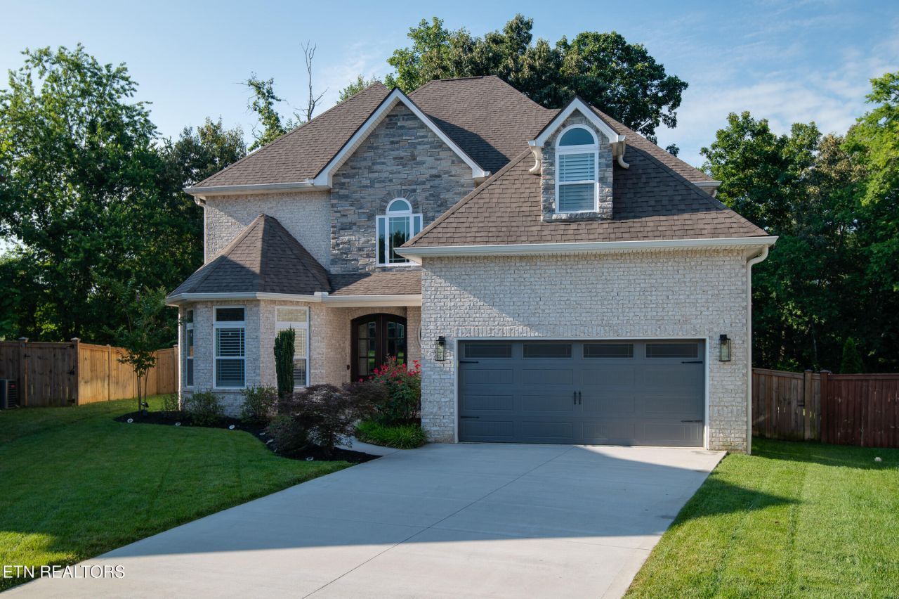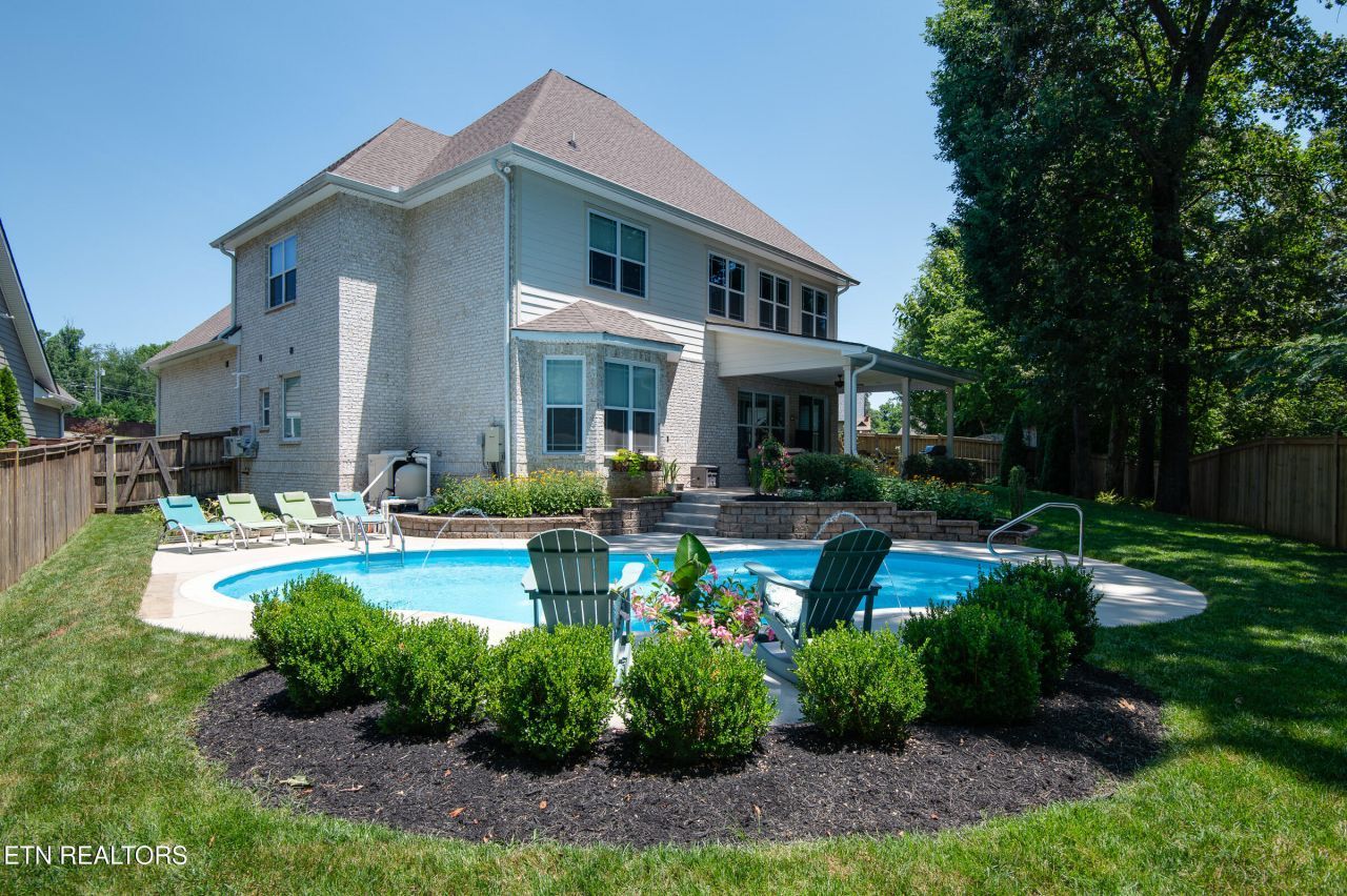 Beautiful home on a quiet cul-de-sac in sought-after 37919. Features include an open floor plan, hardwood floors, double crown molding main floor, 2nd floor crown throughout, and a main-level primary suite with custom walk-in closet. Large multi-use room attached to a bedroom upstairs often described as a flex room. From the two-story foyer, you can see clear to the backyard and trees. The kitchen has plenty of granite counter working space, under cabinet lighting, a convenient pantry and lots of soft close drawer space. Enjoy a professionally landscaped, fenced backyard with a saltwater pool and covered patio backing to wooded views. Ample storage throughout. Move-in ready!